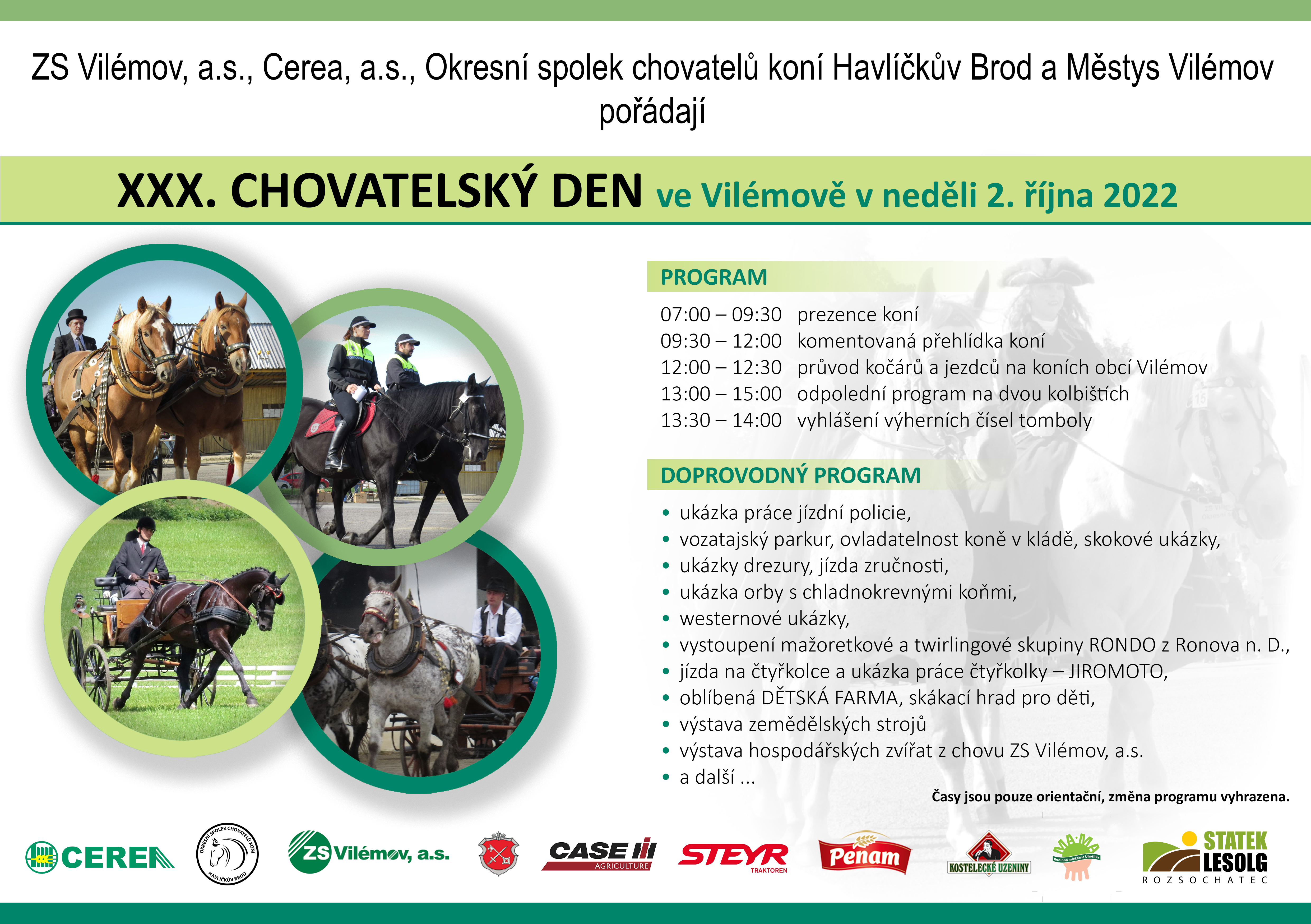 Kdo se Chovatelského dne v minulosti účastnil ví, že se jedná o pohodovou akci, kde si na své přijdou milovníci koní, milovníci zemědělských strojů, milovníci dobrého jídla i děti všech věkových kategorií. Na úvod celého dne předvedou své umění mažoretky ze skupiny Rondo, a děvčata jsou opravdu šikovná. Poté bude následovat tradiční komentovaná přehlídka koní zakončena průvodem. Přesně ve 12 hodin vyjíždí průvod kočárů a jezdců na koních do ulic Vilémova. Průvod je doprovázen hudební produkcí a snad každému návštěvníkovi jde při pohledu na tu krásu mráz po zádech :-)