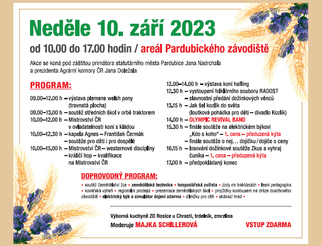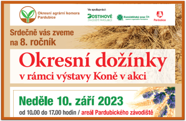 Milí přátelé, obchodní partneři i kolegové, přijměte pozvání na Okresní dožínky, které pořádá OAK Pardubice a Cerea se zde také již tradičně podílí. Program je naplněn "až po okraj", ještě to počasí, aby nám přálo.