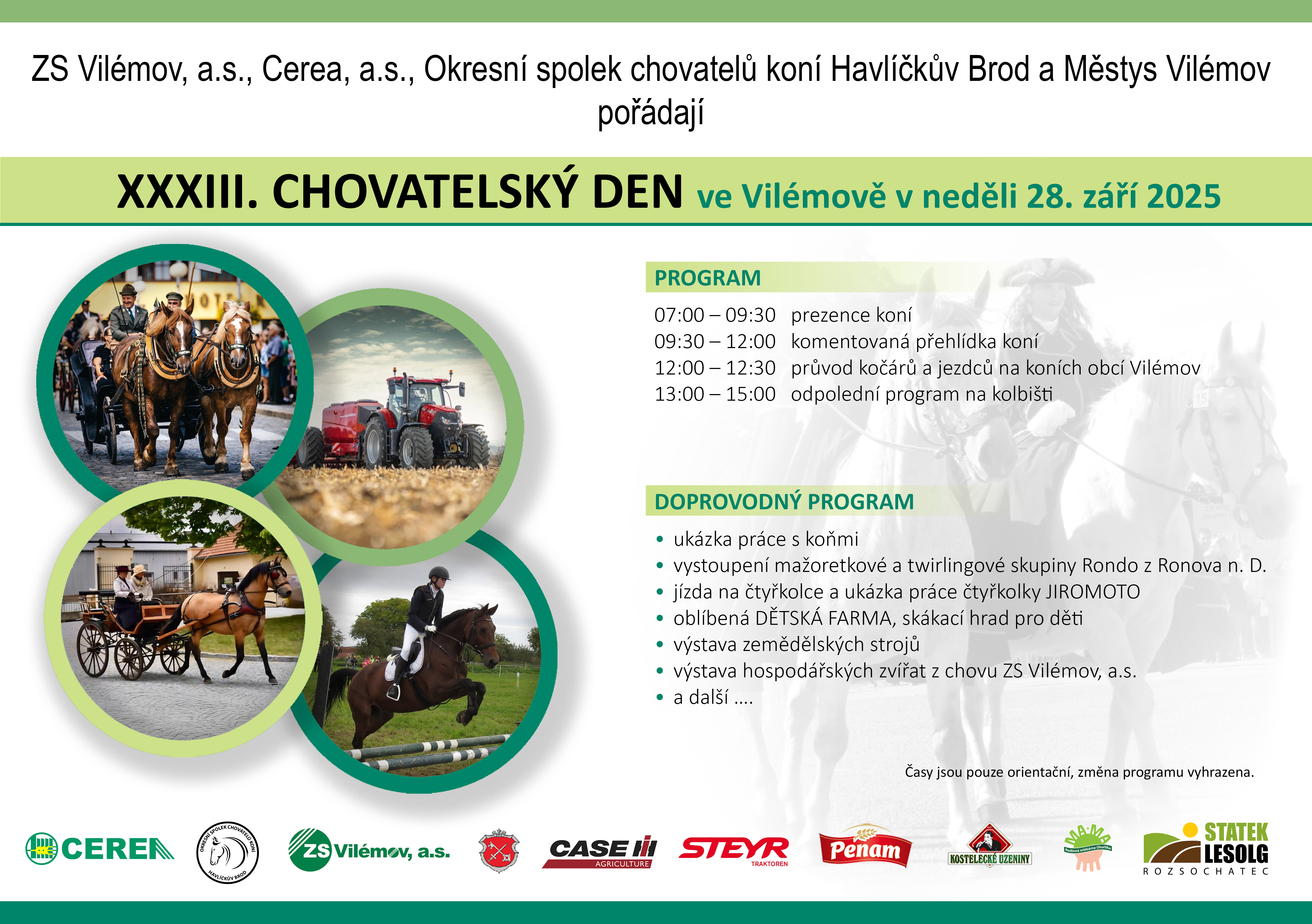 Přinášíme srdečné pozvání pro všechny na třiatřicátý ročník svátku koní. Vezměte rodinu na výlet a užijte si Chovatelský den ve Vilémově u Golčova Jeníkova.