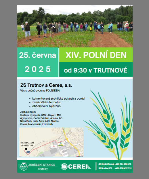 Již po čtrnácté spolupořádáme POLNÍ DEN se Zkušební stanicí Trutnov, který se rychle přiblížil. Ve středu 25. června se sejdeme na poli za tratí, kde na vás čekají skvěle připravené pokusy. Občerstvení a počasí bude fajn, tak přijměte pozvání a přijeďte. Těšíme se na vás!