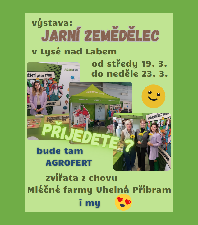 V Lysé nad Labem probíhá tradiční výstava Jarní Zemědělec – a letos tam nebudeme chybět ani my! Najdete nás na stánku Agrofertu , kde se rádi setkáme se zákazníky i známými. Přijďte si popovídat a načerpat inspiraci! Počasí slibuje teplo a sluníčko, ideální čas na výlet. Těšíme se na vás!